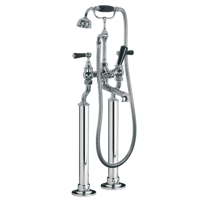 Classic black lever bath shower mixer with standpipe sleeves and adjustable baseplates for rim mounting
