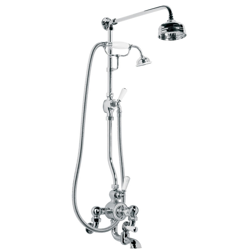 Exposed thermostatic bath and mixing valve, riser kit, handset, lever diverter, 5" rose and adjustable riser pipe bracket Wall mounted